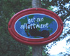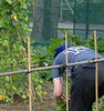 Description: Me weeding the allotment, with the tomato supports and the beantrellis