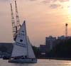 Description: A Wayfarer dinghy on the docks at Canary Wharf at sunset