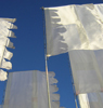Description: White flags against a blue sky, at the Glade Festival